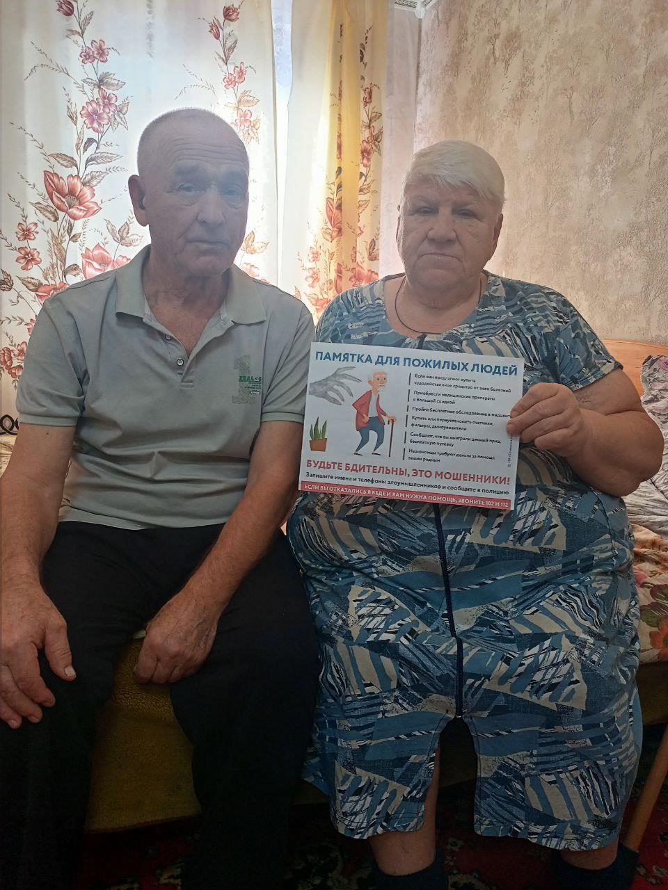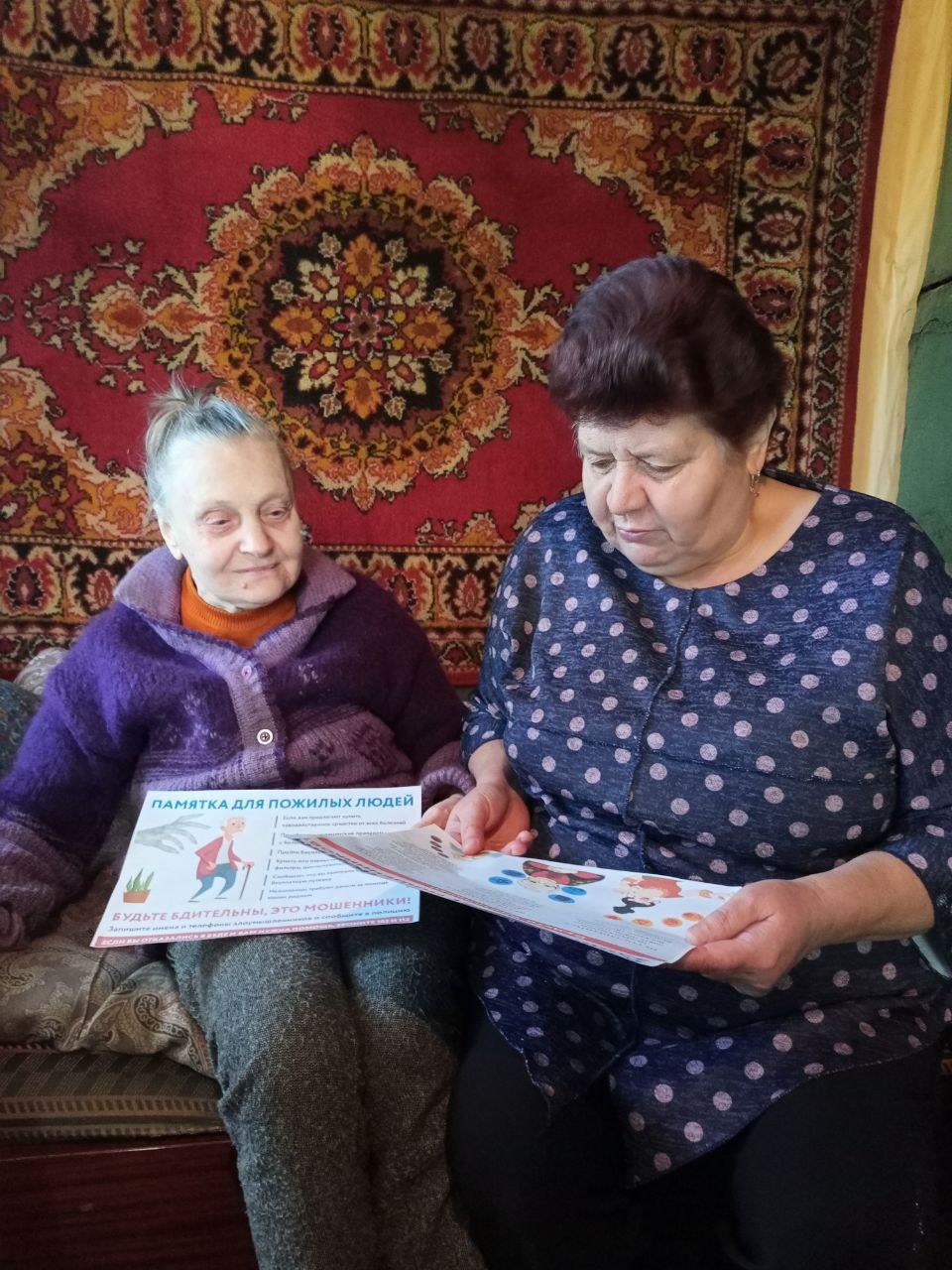 Социальные работники Пилясова Е.В., Куликова Н.Н. и медицинская сестра Куликова Т.В. отделения социально-медицинского обслуживания на дому с. Борнуково провели беседы с получателями социальных услуг о безопасности и подарили памятки. Обсудили примеры мошенничества, чтобы предотвратить попадание в неприятные ситуации.