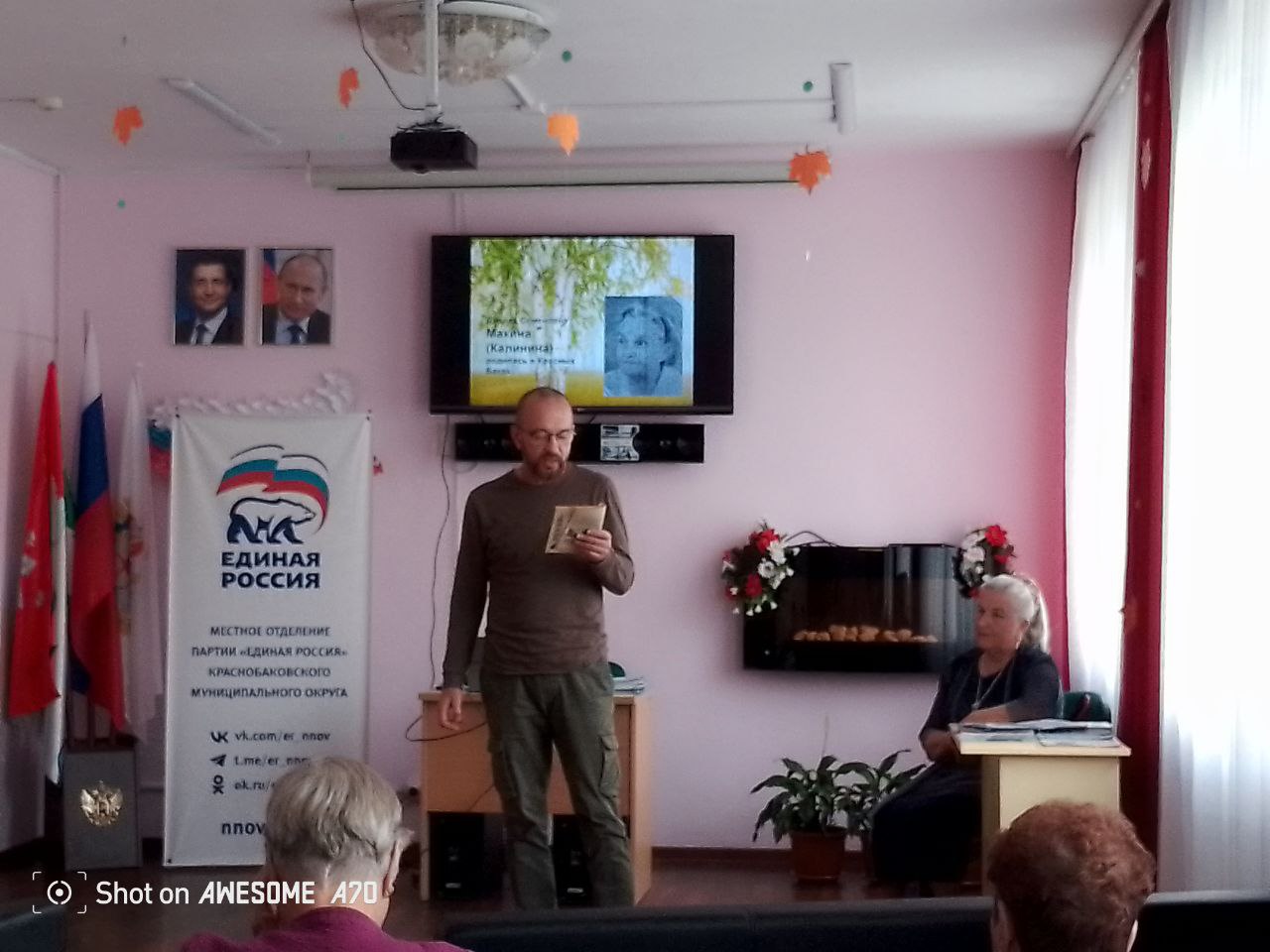 В исполнении Андрея Робертовича Шабарова и Ларисы Викторовны Шишкарёвой очень трогательно и душевно звучали стихи различной тематики - от лирики до военной темы, также были показаны видеофрагменты с песнями о реке Ветлуге, о российской деревенской глубинке, подготовлена выставка книг со стихами поэтов - земляков. Всего за какой то час мы познакомились с творчеством 11 поэтов - краснобаковцев.