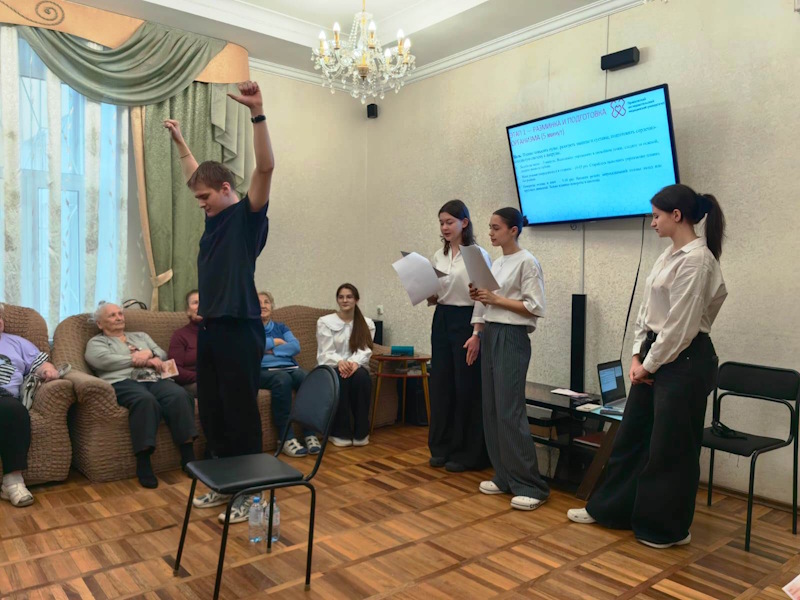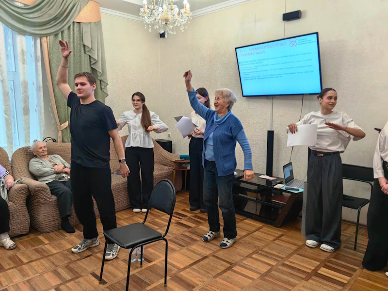 Пенсионеры с интересом выслушали информацию и активно повторяли упражнения вместе со студентами. Это взаимодействие молодого и старшего поколений оказалось не только полезным, но и приятным, подарило положительные эмоции и стало примером плодотворного обмена опытом.